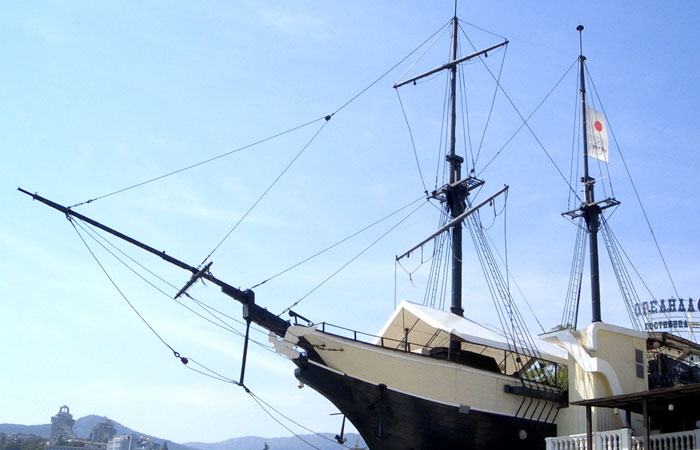 Напротив «Ореанды» находится еще один символ курорта — шхуна «Эспаньола». Это судно построили на Ялтинской киностудии в 1970 г. для съемок кинофильма «Остров сокровищ». Позже судно снимали еще в нескольких фильмах. Сейчас гостей здесь принимает стилизованный бар, официанты которого одеты в костюмы XVII века.